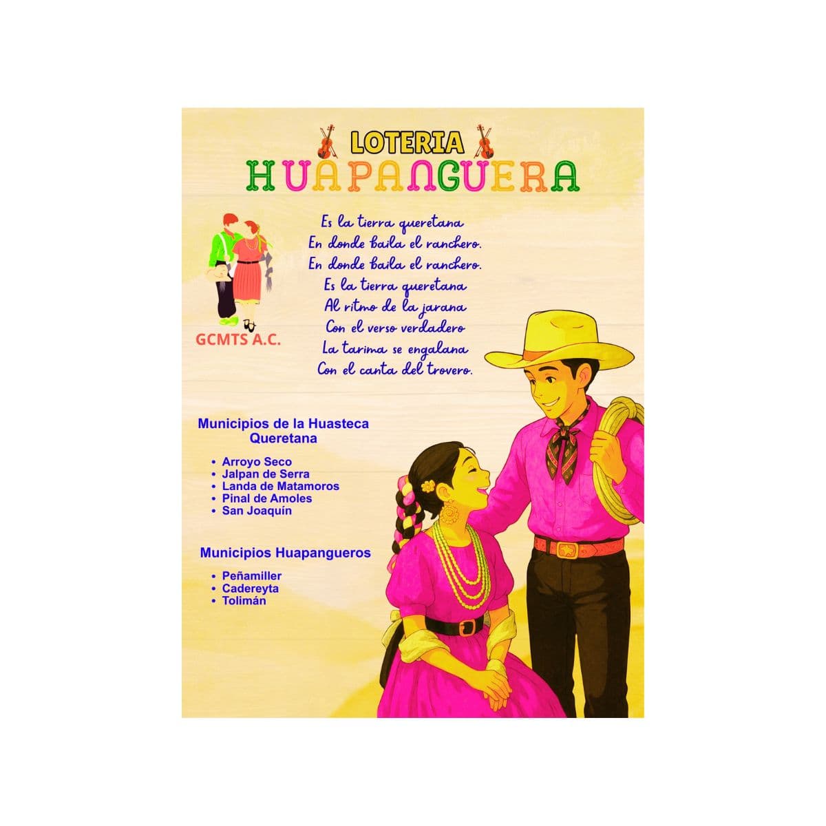 La lotería huapanguera está inspirada en la música, la danza y la poesía de la región Huasteca, con cartas que representan instrumentos tradicionales, huapangueros, bailadores, versos, fandangos y símbolos del paisaje serrano.
